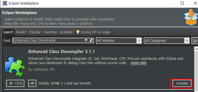- TopMenu > Help > Eclipse Marketplace : class decompiler 검색 설치