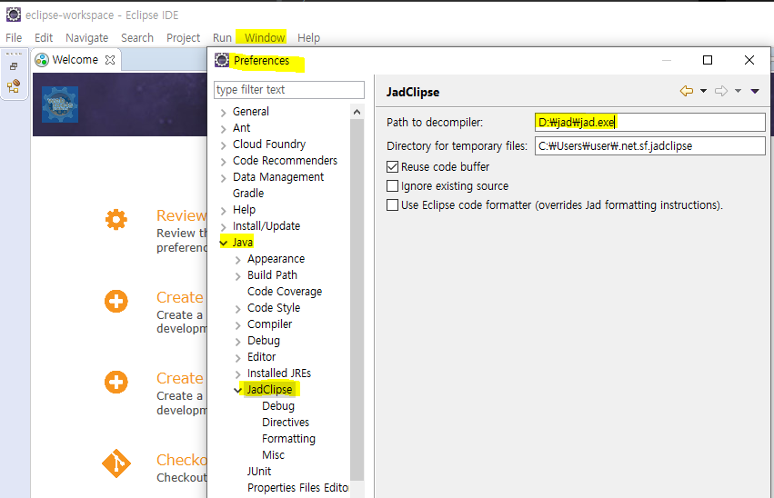 - TopMenu > Window > Preferences > Java > JadClipse 메뉴 추가 확인