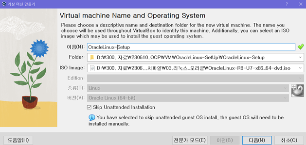 1) 새로만들기(=가상머신 만들기)를 클릭한 후 아래 이미지 와 같이 이름/Folder(ova파일이 생성될 경로)/읽어올 ISO Image를 설정해준다.