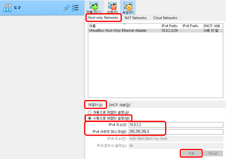 4) 속성 토글 > 어댑터 > 수동으로 어댑터 설정 > 주소&서브넷 마스크 입력 > 적용