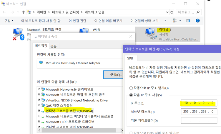 5) 네트워크 설정에 새로운 이더넷 10.0.2.2 가 추가된 것을 확인 (ipconfig /all로 확인해도 된다)