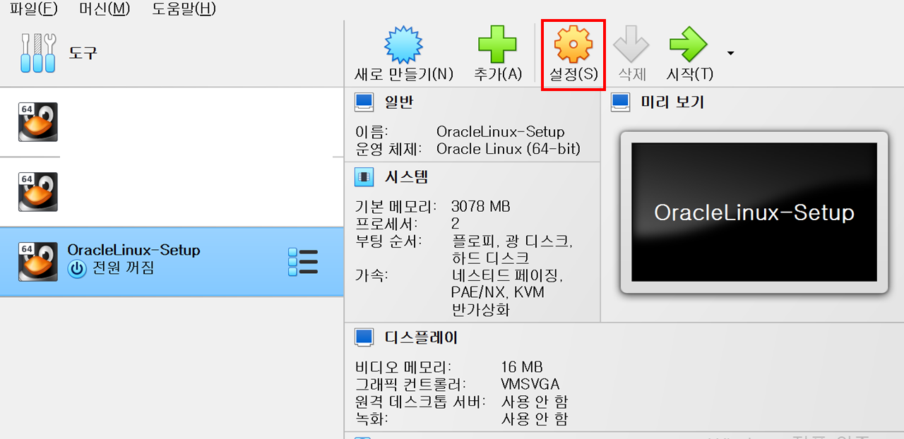3) 새로운 가상머신이 생긴것을 확인할 수 있다. 설정을 클릭