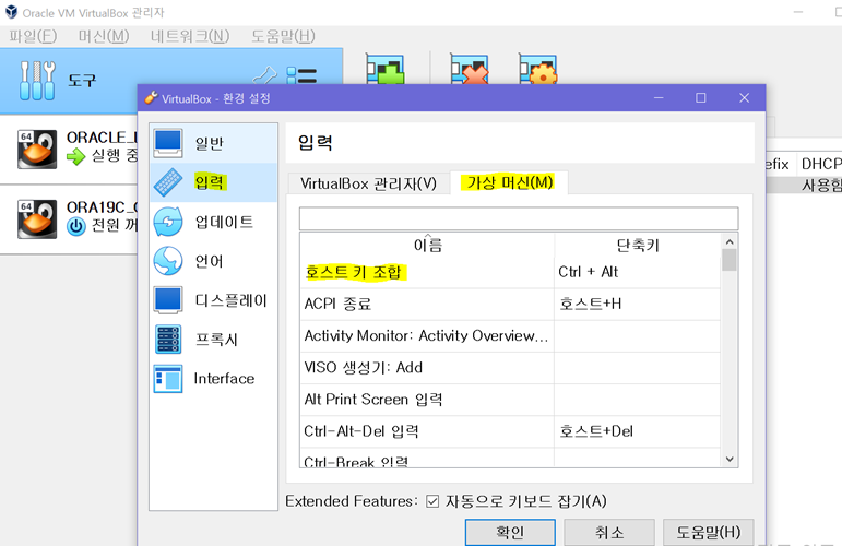 2) 환경설정 > 입력 > 가상머신 탭 > 원하는 호스트키 입력