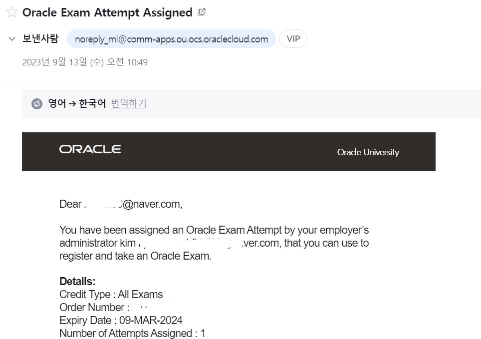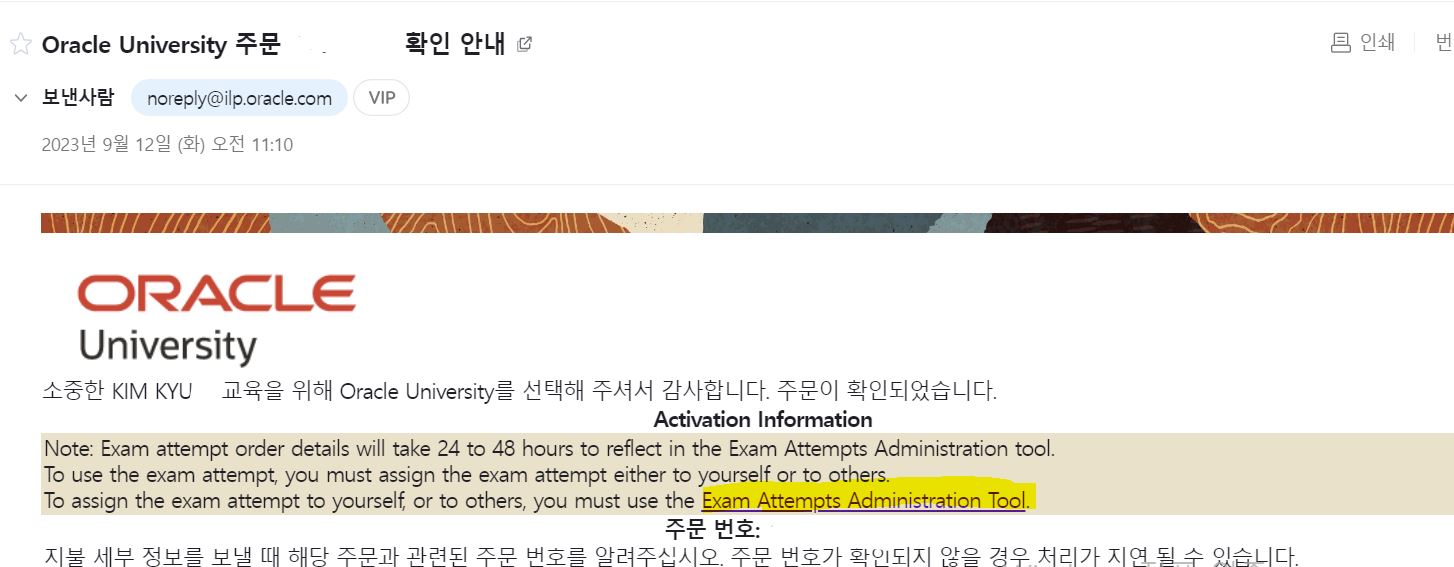 5) 메일함에서 Oracle Exam Attempt Assigned 메일을 확인하면 드디어 바우처를 사용해 시험을 예약할 수 있다. 반영에 평일 1시간 ~ 48 시간 소요