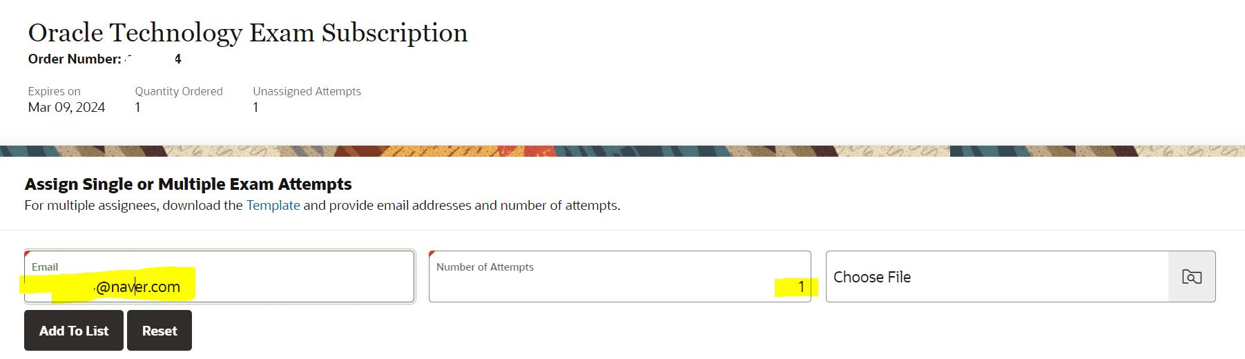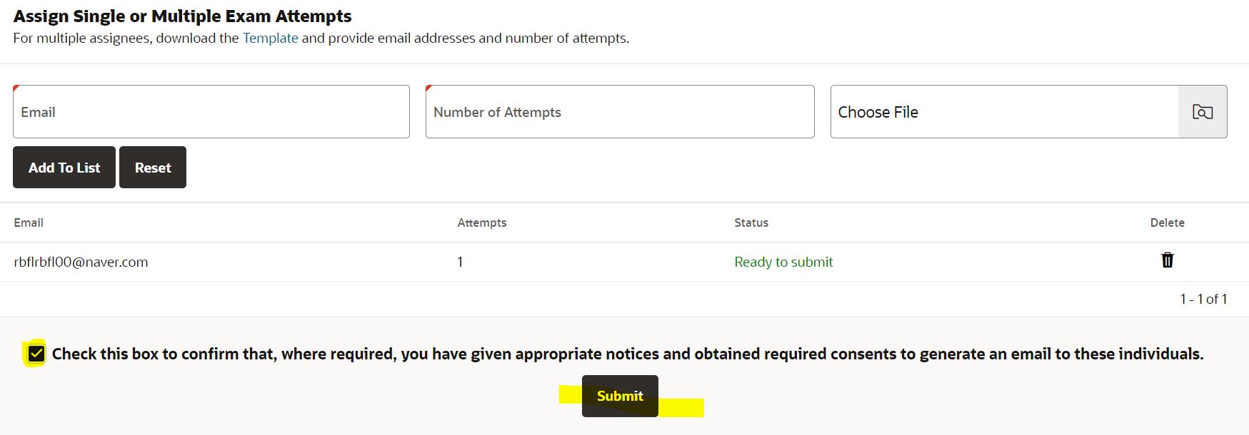 3) Assign Exam Attemps 을 클릭하면 나오는 폼에 메일주소, 사용 수량 입력