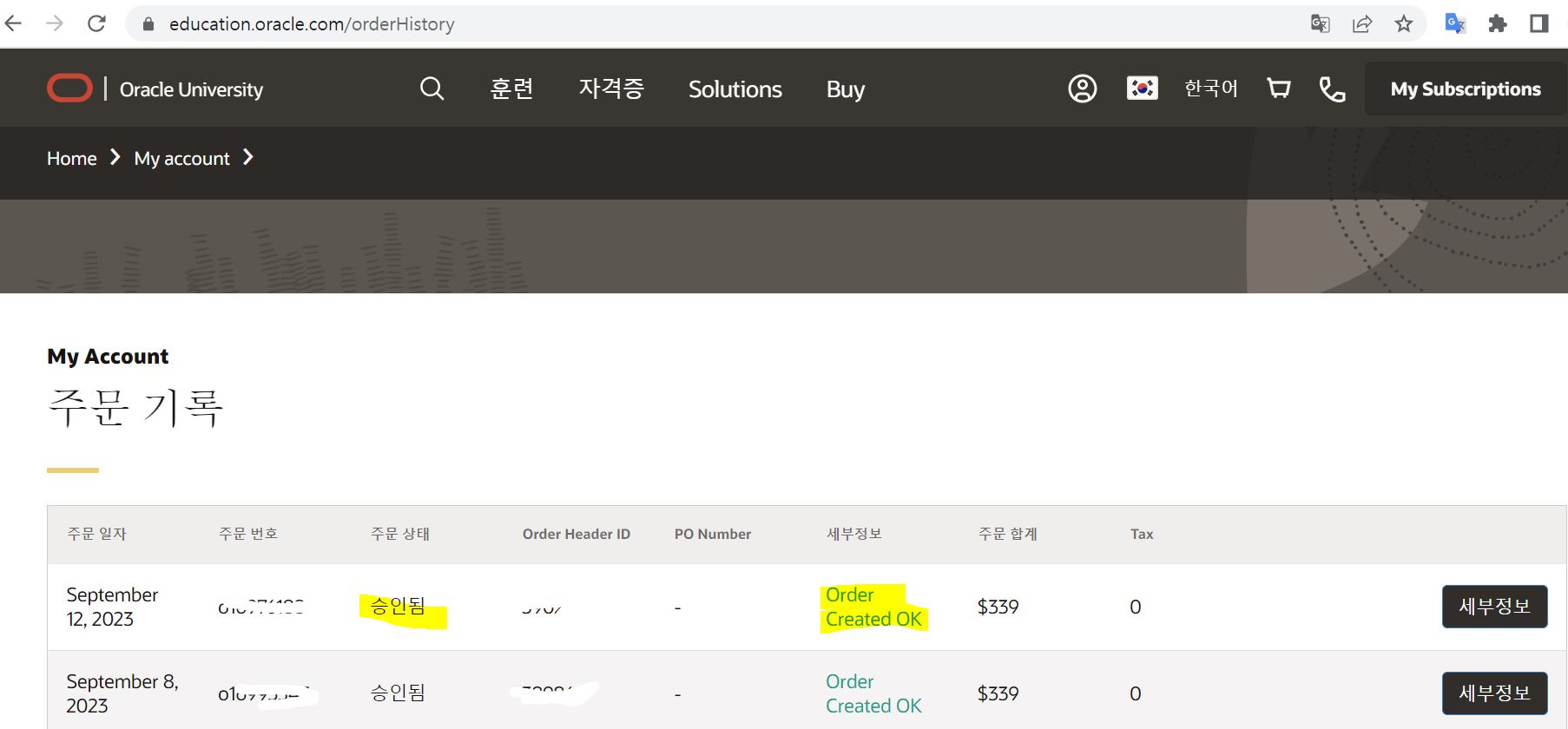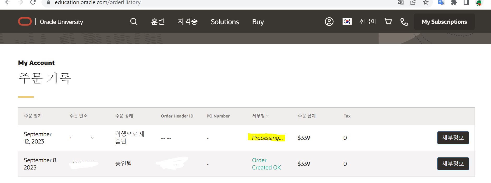 ※ 이 화면은 Mail: IT Training and Certification for Oracle Technology | Oracle University Order # (주문번호) > Check your order status here 로도 접속 가능