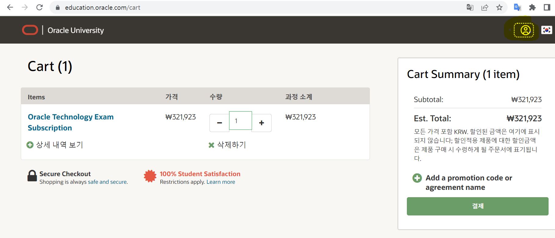 6) 결제내역 확인 후 결제 클릭, 이때 우측상단에 사람아이콘을 클릭해 계정에 정상적으로 로그인 되어있는지 확인