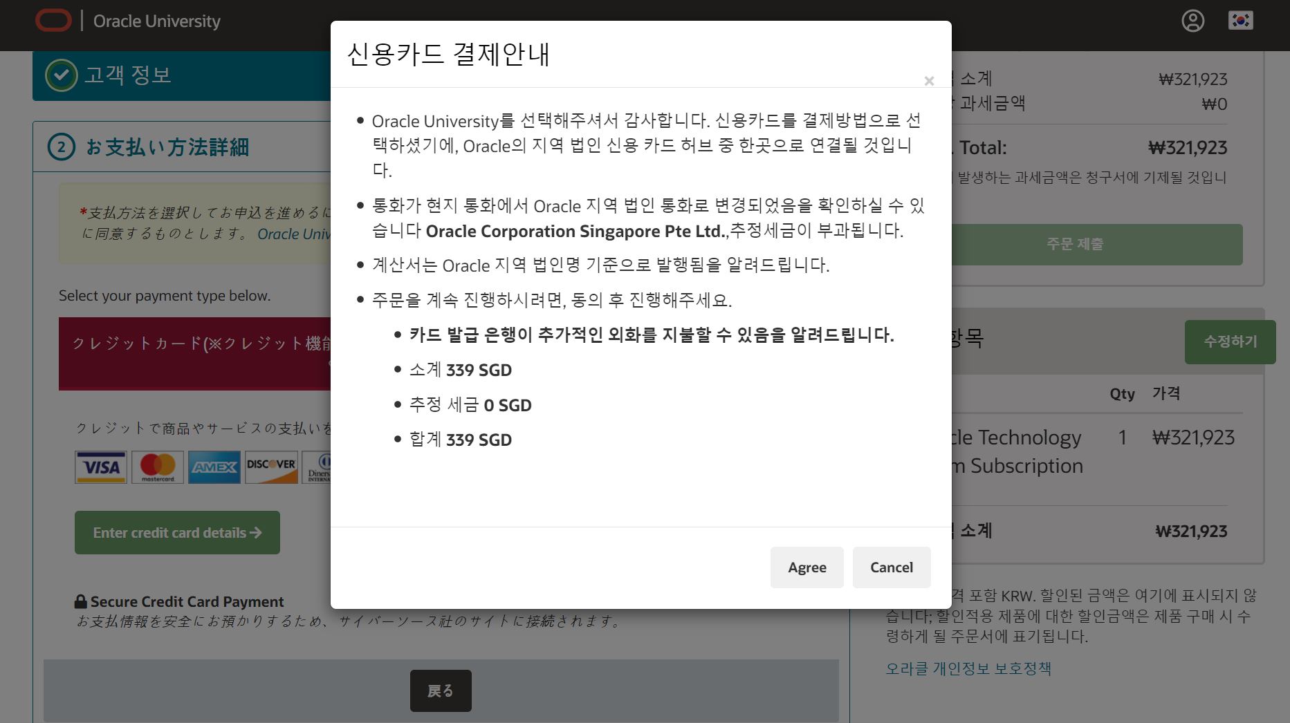 8) Enter credit dard details 클릭, 환거래 차액이 발생한단 팝업을 확인후 Agree