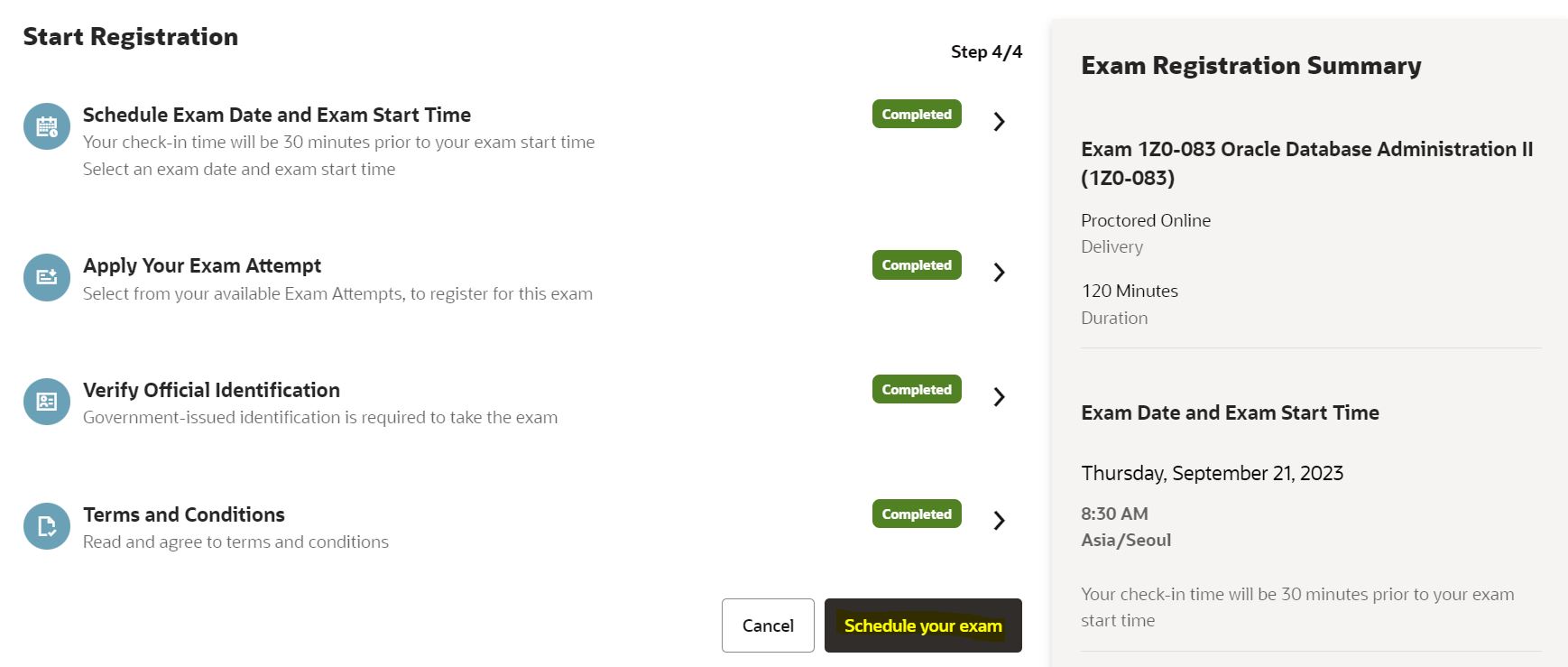 3) Apply Your Exam Attempt ~ Verify Official Identification ~ Terms and Conditions 항목을 Compleated 되도록 체크체크체크 후 Schedule your exam 클릭