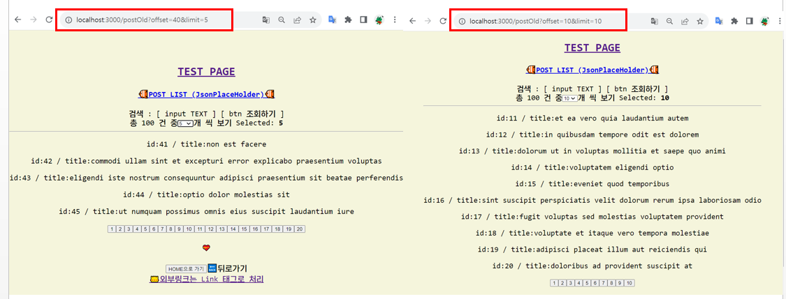 이제 쿼리스트링 값이 안보이는데 문제는 n개씩 보기를 구현할 수가 없다. 이유는 2) 번은 페이징을 누를때마다 데이터를 요청받는 방식이고, 3) 번은 전체 데이터를 한번에 가져오는 방식 (SPA:Single Page Application) 이라.. 구현하라면 구현할 순 있겠지만 단순 페이징 만드는데.. 😂