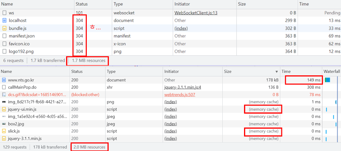 - 리액트가 무거운 편이래서 배포만들고 개발자도구로 Spring 사이트랑 비교해봤다.