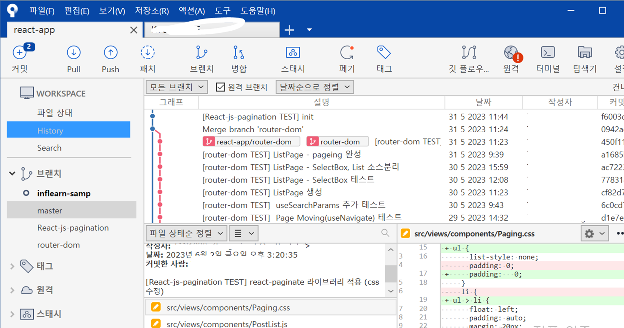 두가지를 합해서 프로토타입을 만들어봤다. Query String 값을 가져올 수 있는 hook : useLocation, useSearchParams 을 사용해서 페이징도 잘 되고 갯수조절도 잘 되는데.. 헤더에 쿼리스트림이 보이는게 마음에 안든다.. 페이징라이브러리를 바꿔서 다시 만들어 봤다.